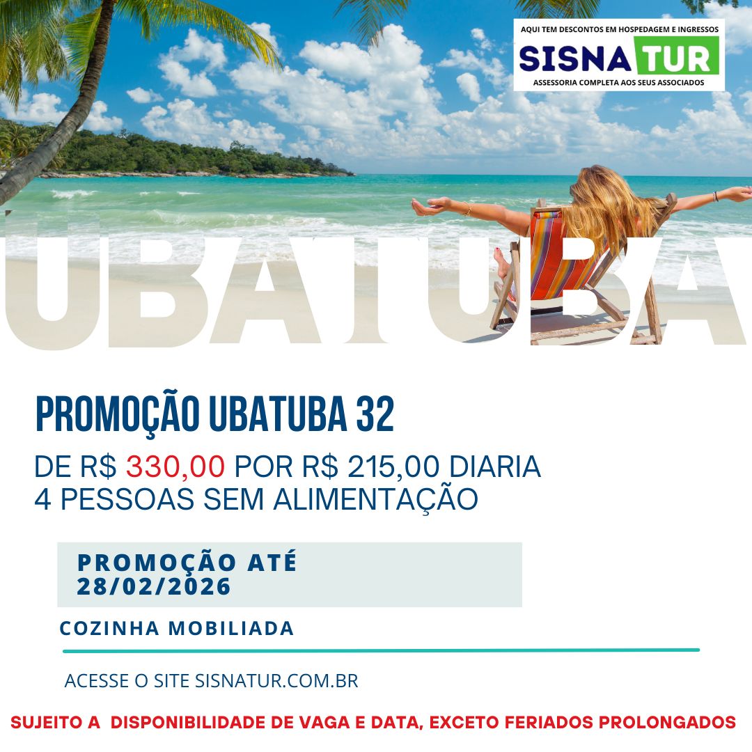 Aproveite a Promoção Ubatuba 32 com diária de R$ 215,00 para até 4 pessoas, em acomodação com cozinha mobiliada. 📆 Promoção válida até 28/02/2026 ⚠️ Sujeito à disponibilidade ...