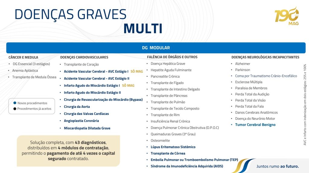 O plano oferece uma solução completa, com 43 diagnósticos cobertos, organizados em 4 módulos de contratação, possibilitando o recebimento de até 4 vezes o capital segurado. Entre as coberturas estão doenças como câncer, problemas cardiovasculares, falência de órgãos e condições neurológicas incapacitantes, além de procedimentos complexos como transplantes e cirurgias de alta complexidade.